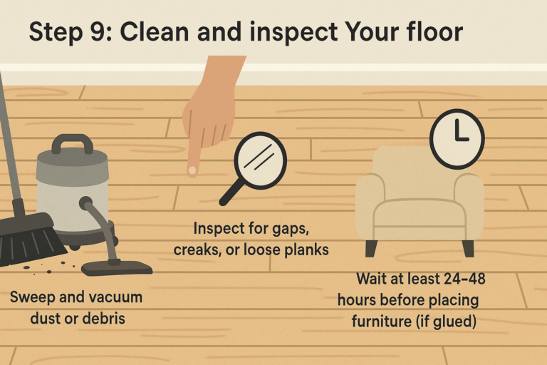 If glued down, wait 24–48 hours before adding furniture or rugs. This helps the glue cure fully and keeps the floor in place.