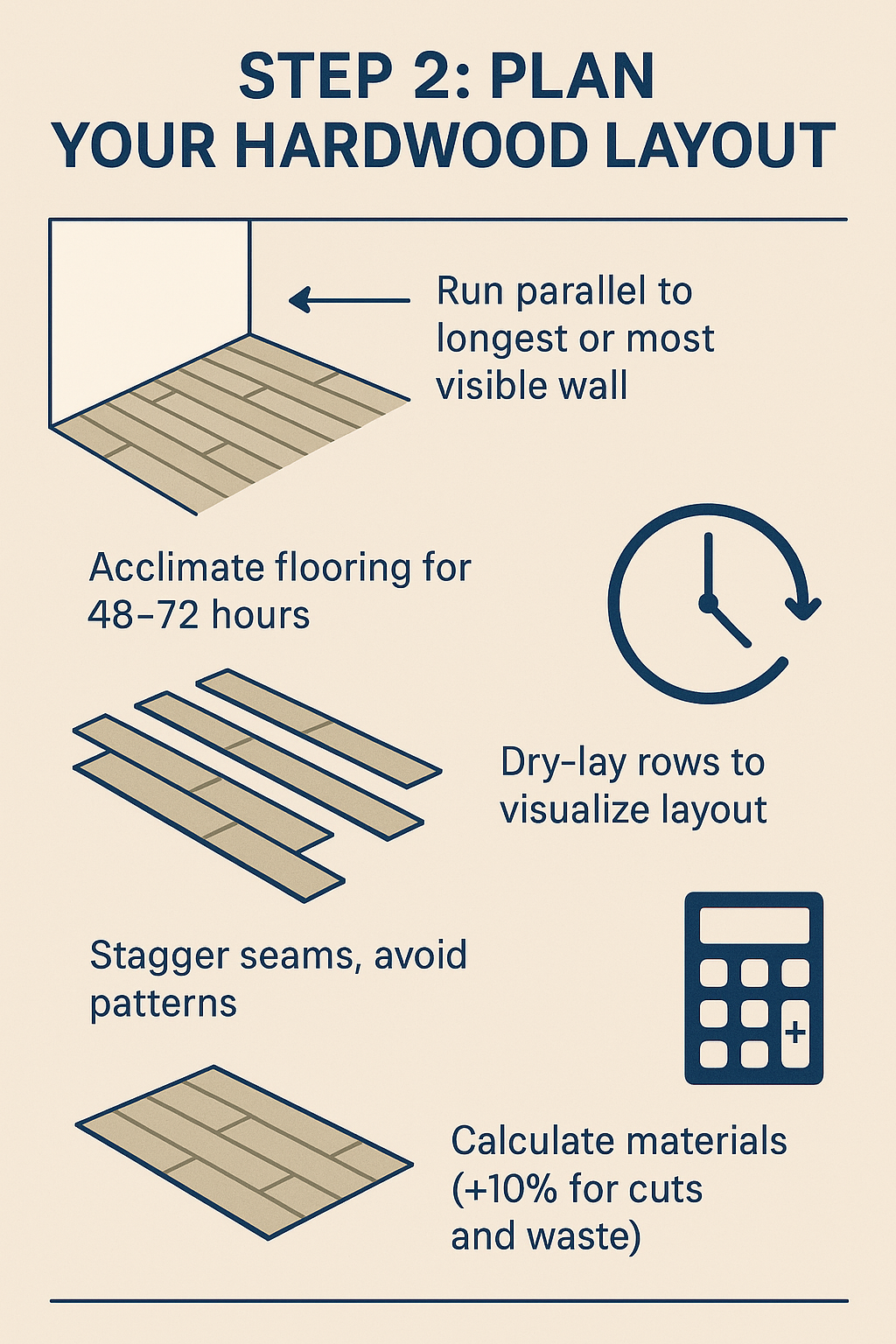 For most rooms, lay hardwood planks parallel to the longest or most noticeable wall. This helps the room feel bigger. If working in several rooms, think about how planks will line up through doorways.
